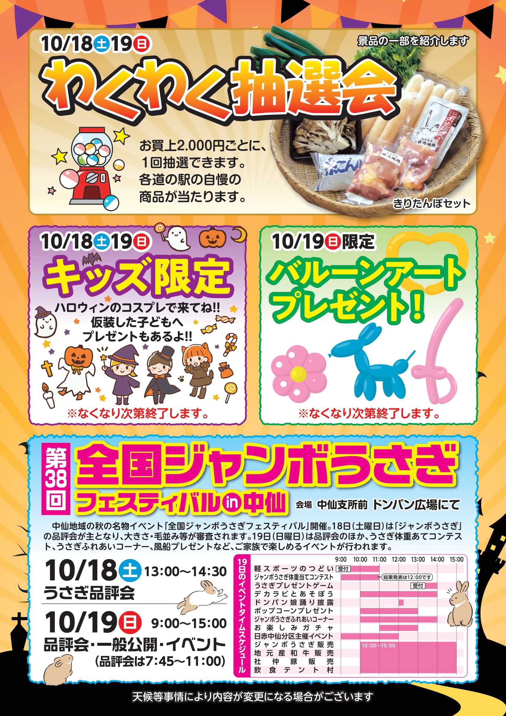 さらに、お買上2,000円ごとに1回抽選できる「わくわく抽選会」、ハロウィン仮装をしたお子様にはお菓子のプレゼントなど、見逃せない内容です。19日(日)には「バルーンアートプレゼント」もあります(なくなり次第終了)。中仙地域ならではの温かなおもてなしと、笑顔いっぱいの催しで迎えてくれる2日間になりそうです。
