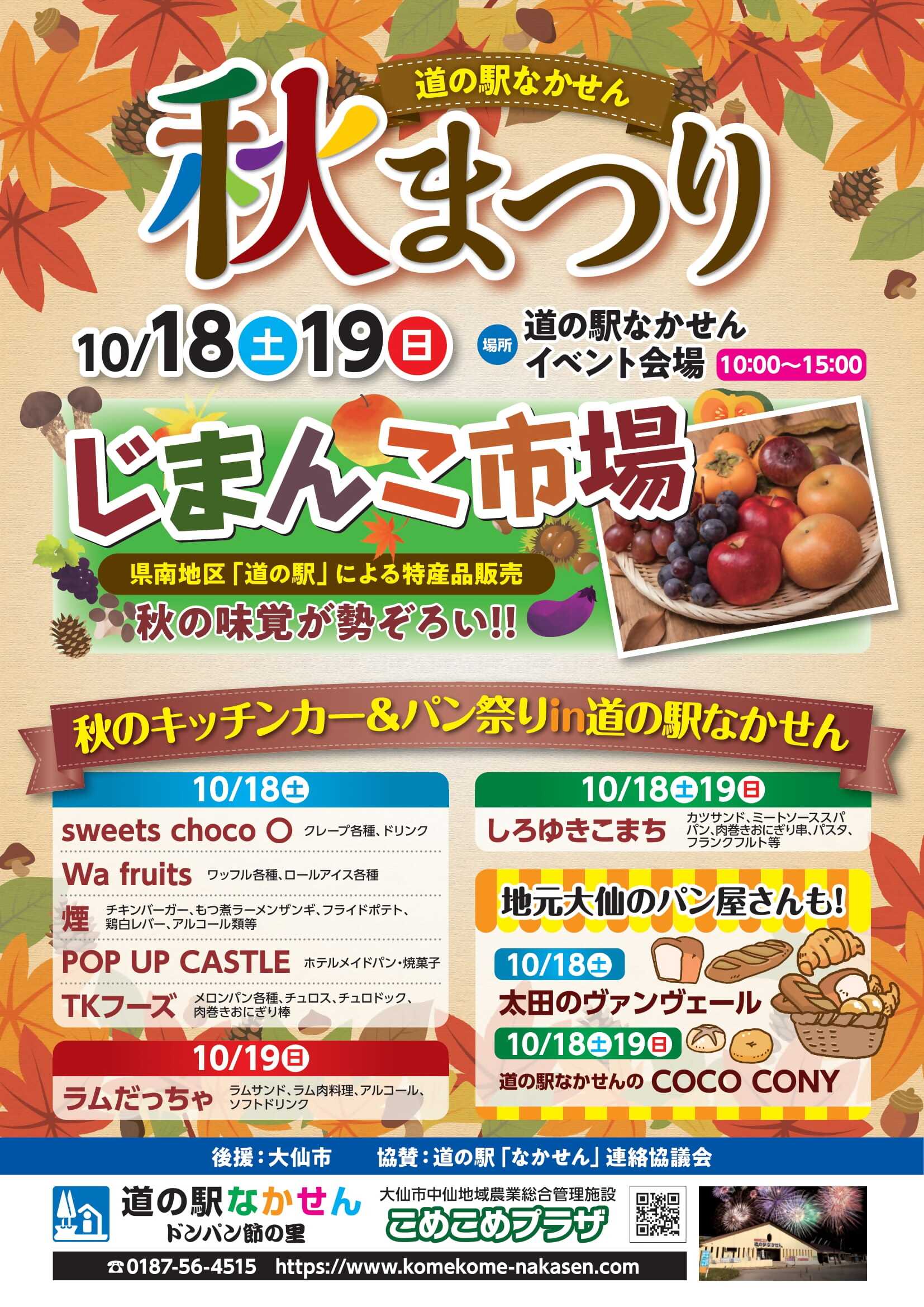 そして、収穫の秋を祝う「道の駅なかせん 秋まつり」も見逃せません。文字通り秋の訪れを感じながら、家族みんなで楽しめる企画が盛りだくさんのイベントです。県南の道の駅が大集合する「じまんこ市場」には、特産品や新鮮な農産物、旬の味覚が並び、地元の魅力をたっぷり味わえます。注目のグルメが並ぶ「キッチンカー&パン祭り」も見逃せません。